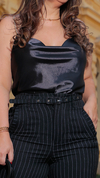 Sofisticação com nossa regata de cetim, apresentando uma gola boba e alças douradas. Uma combinação elegante que vai fazer você se destacar em qualquer ocasião.